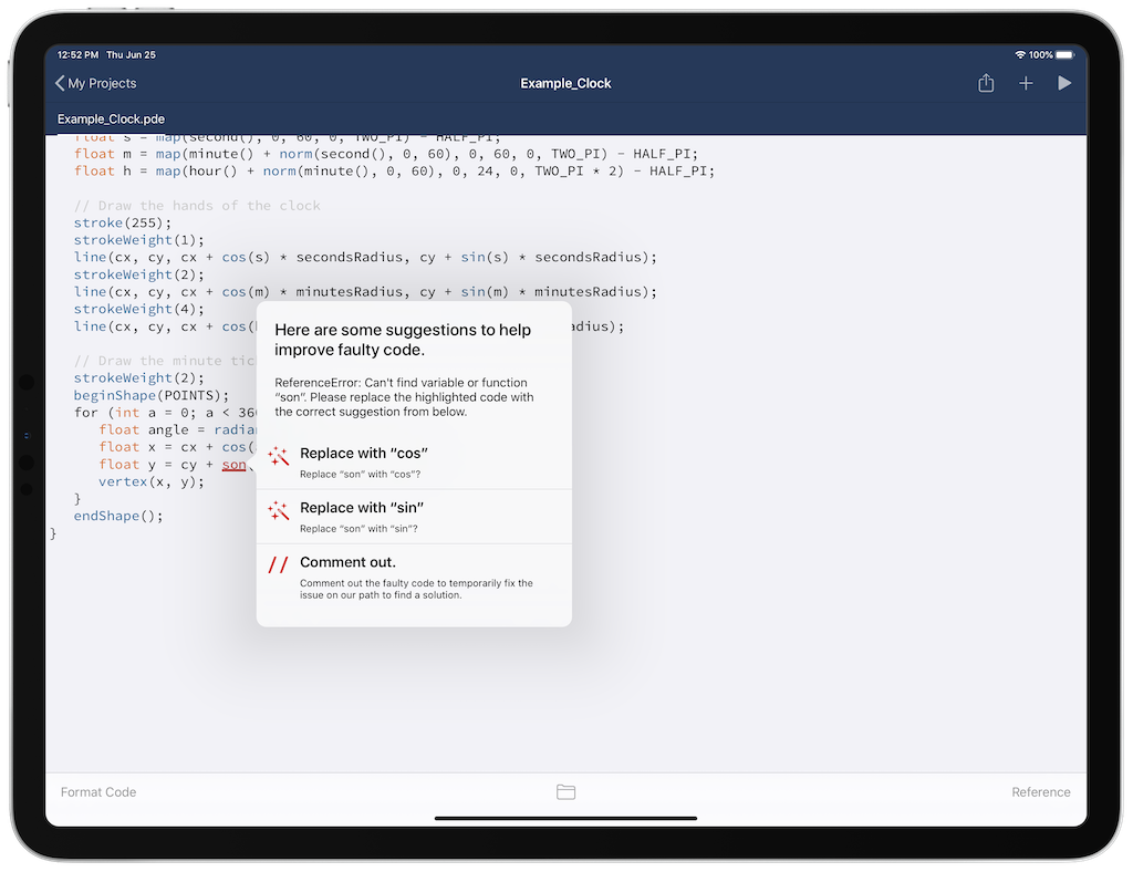 Processing for iOS gives suggestions where faulty code might be, and how to fix it.